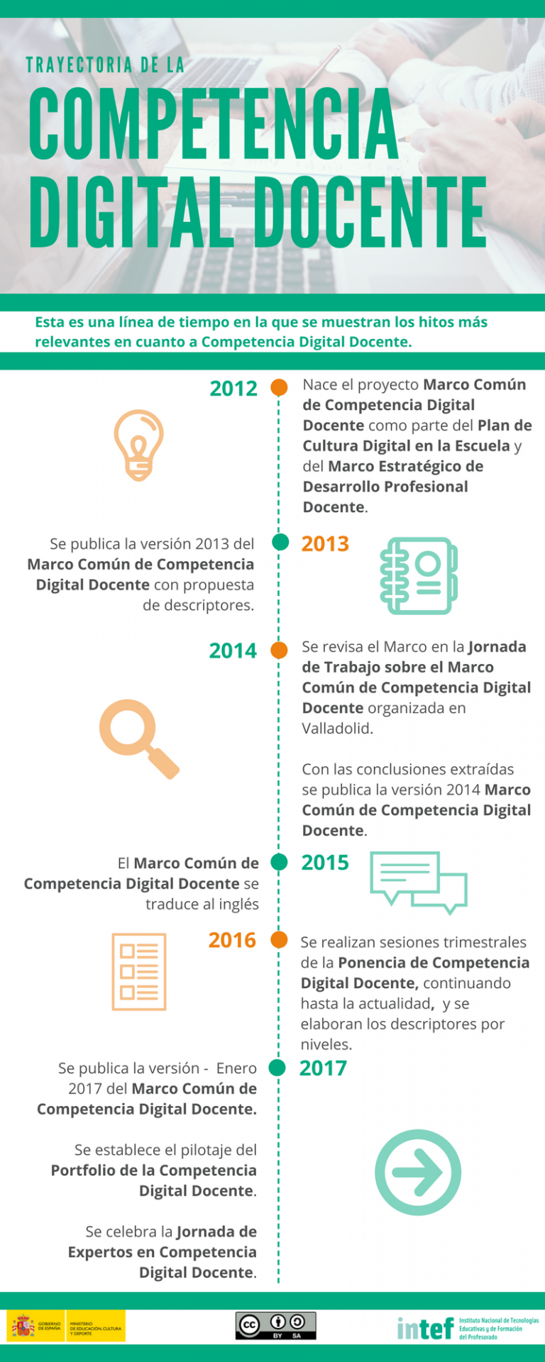 Al igual que el mundo digital evoluciona constantemente, también lo hace el MCCDD, y en 2017 se ha publicado una actualización, accesible en la página de Educalab dedicada a las Competencias Digitales Docentes. En esta página aparece una infografía que muestra la evolución del MCCDD desde 2012 hasta hoy.
