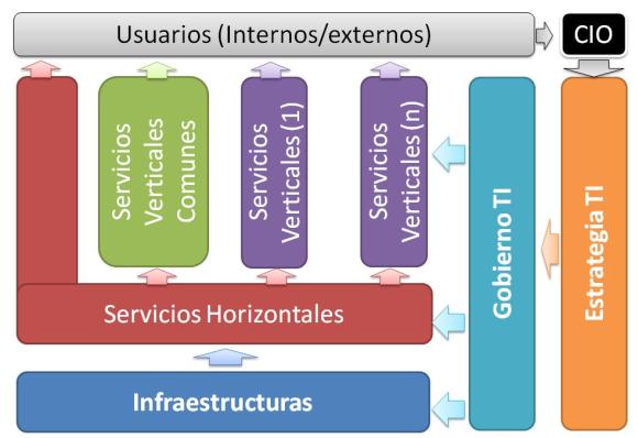 - Servicios Horizontales: Se trata de aquellos servicios que pueden ser aprovisionados con hw/sw estándar de mercado. Los ejemplos típicos son el correo electrónico, la ofimática y la telefonía, sea fija o móvil. En definitiva, en éste ámbito el aprovisionamiento siempre es externo, aunque normalmente la entrega del servicio es interna.